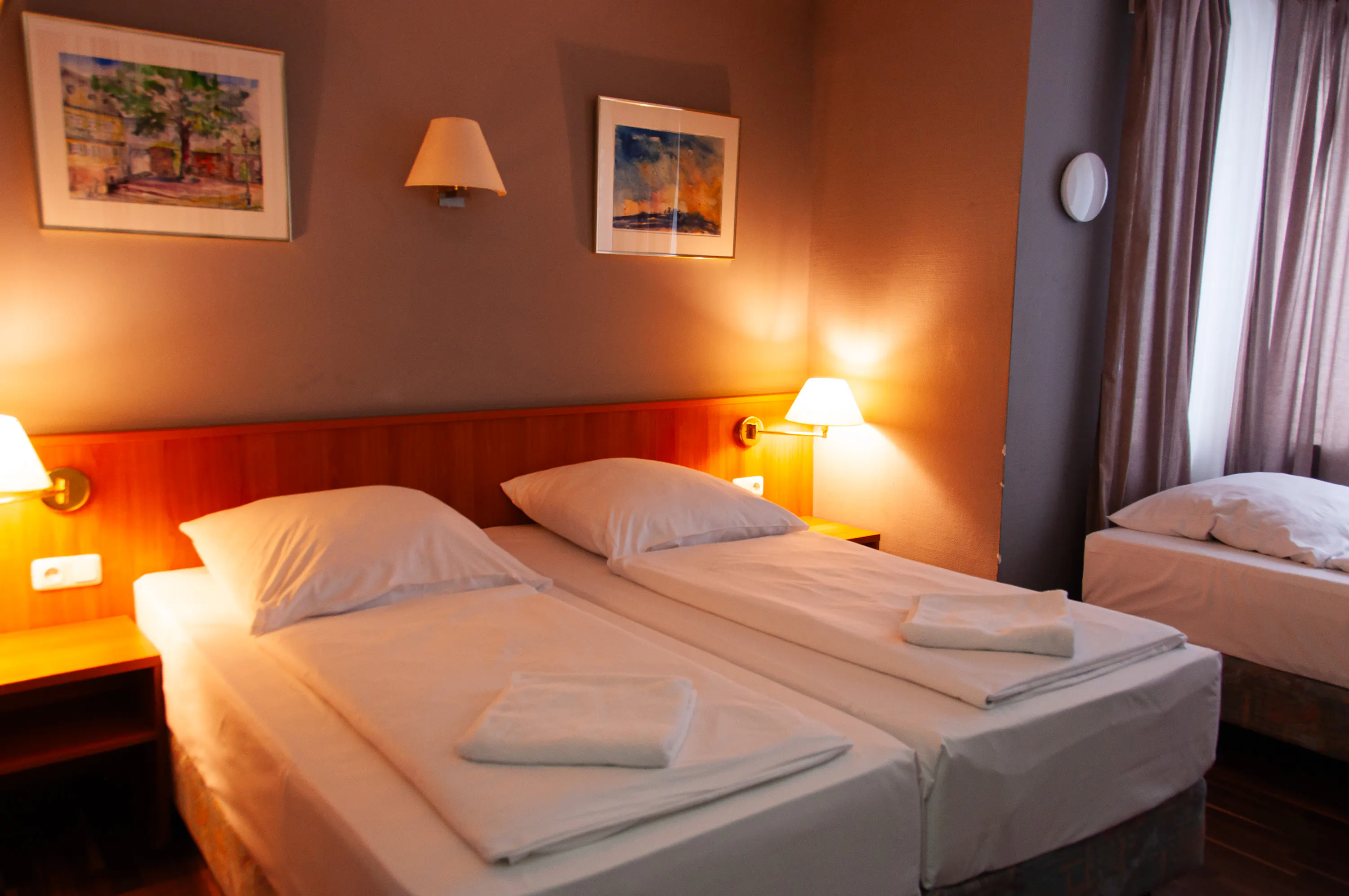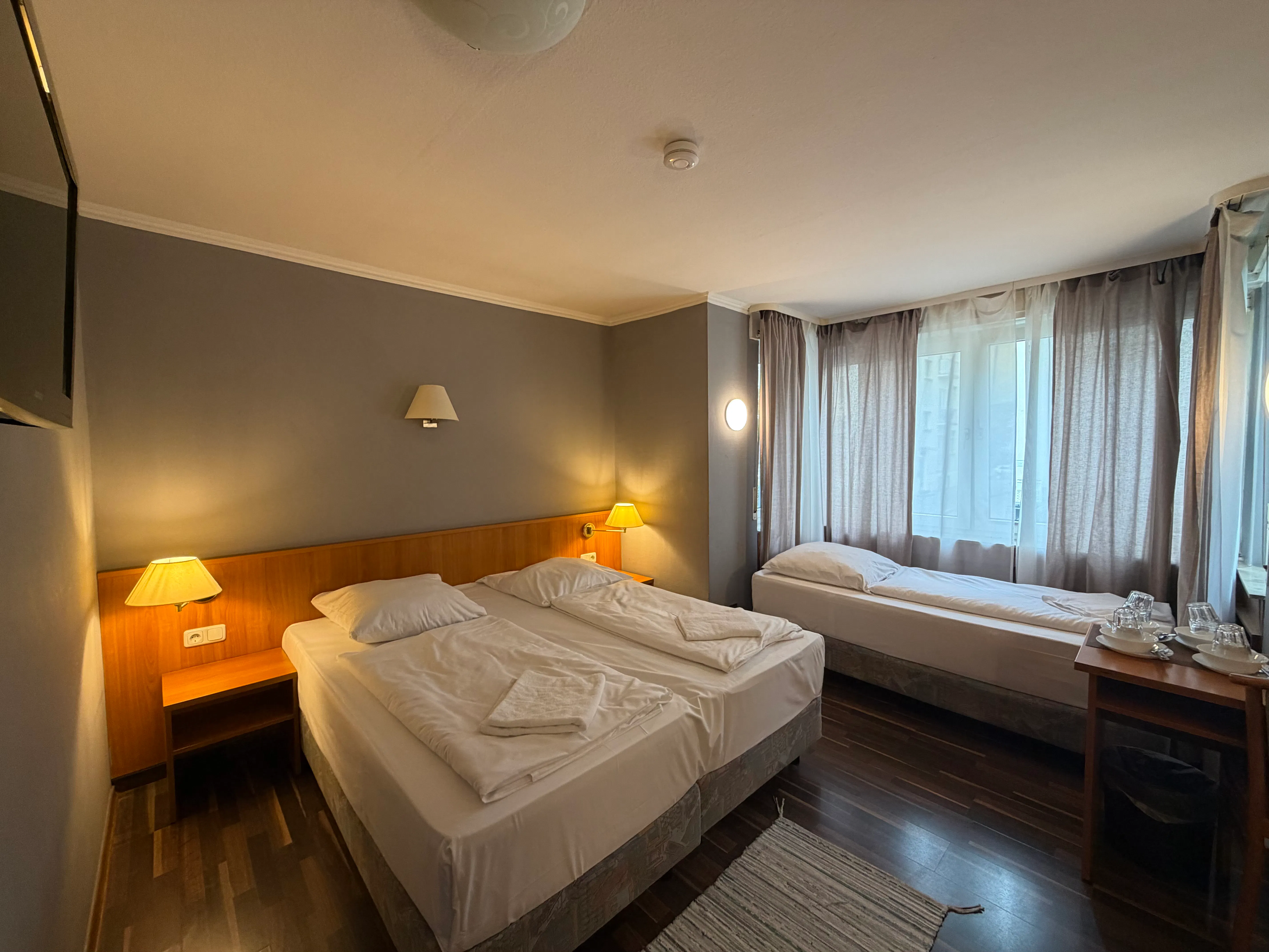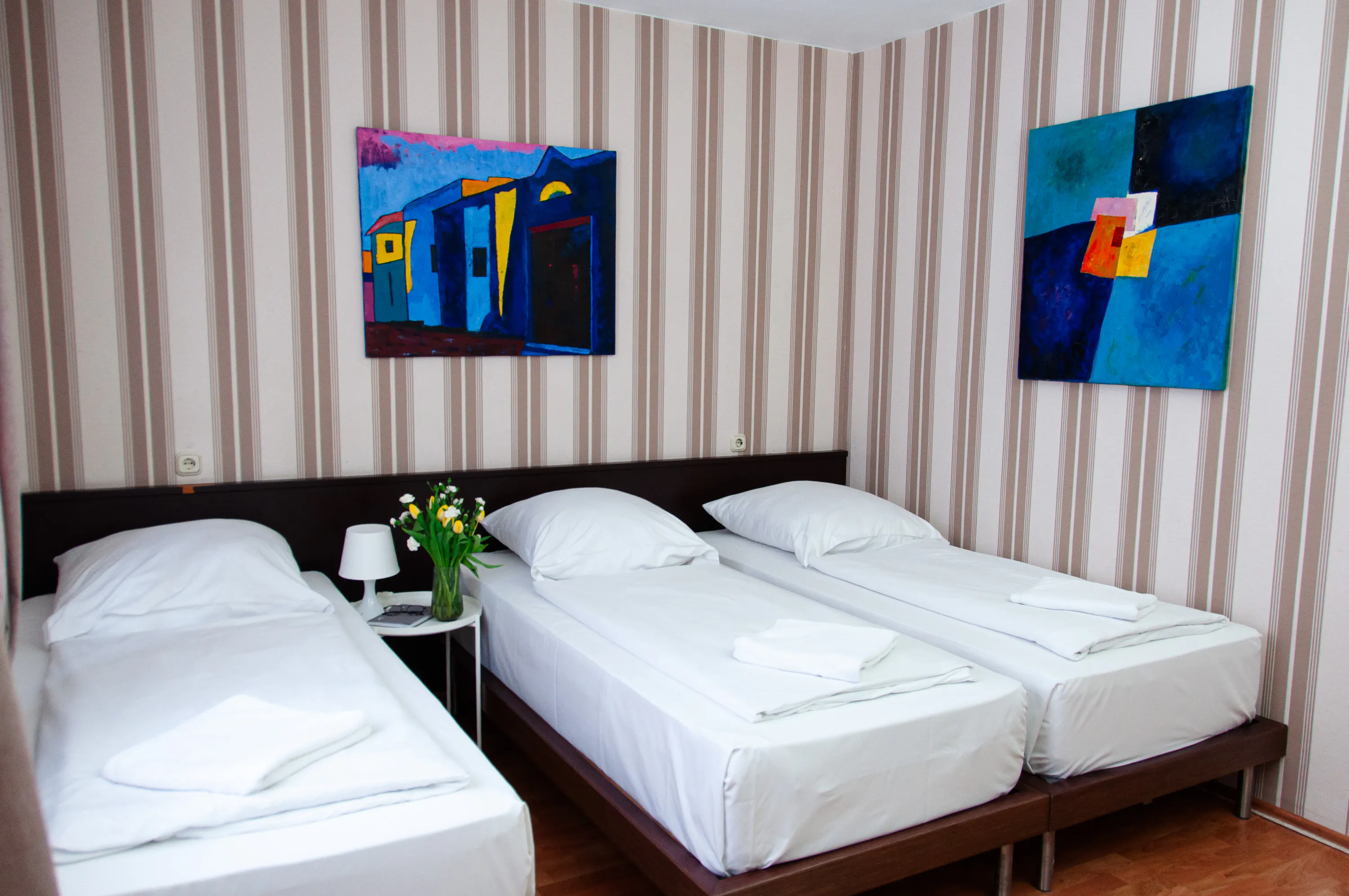 SingleRoom Cozy single room with a comfortable single bed (90x200 cm). Equipped with everything you need: Wi-Fi, private bathroom, and wardrobe. Perfect for solo travelers looking for a comfortable and relaxing stay.SingleDeluxe Cozy single deluxe room with a comfortable double bed (140×200 cm). Equipped with everything you need: Wi-Fi, private bathroom, and wardrobe. Perfect for solo travelers or couples seeking comfort and relaxation.TwinRoom Cozy twin room with two comfortable single beds (90×200 cm). Equipped with everything you need: Wi-Fi, private bathroom, and wardrobe. Perfect for friends or colleagues looking for a comfortable and relaxing stay.DoubleDeluxe Cozy double deluxe room with a comfortable double bed (180×200 cm). Equipped with everything you need: Wi-Fi, private bathroom, and wardrobe. Perfect for couples or solo travelers seeking extra comfort and relaxation.Comfort Triple room Cozy triple room with one double bed (180×200 cm) and one single bed (90×200 cm).Equipped with everything you need: Wi-Fi, private bathroom, and wardrobe. Perfect for a family or friends.QuadRoom Cozy quad deluxe room with a comfortable four single beds (90×200 cm each). Equipped with everything you need: Wi-Fi, private bathroom, and wardrobe. Perfect for couples or solo travelers seeking extra comfort and relaxation.Deluxe Three-Bedroom Apartment This spacious apartment includes 1 living room, 3 separate bedrooms and 2 bathrooms with a bath and free toiletries. Guests can make meals in the kitchen that has a stovetop, a refrigerator, a dishwasher and kitchenware. The apartment offers a washing machine, a tea and coffee maker, a dining area as well as a terrace with city views. The unit has 5 beds.1 Bedroom: one double bed (180×200 cm)2 Bedroom: one double bed (140×200 cm)3 Bedroom: two single beds (each 90x200)Living room: sofaDeluxe Two-Bedroom Apartment The apartment's kitchen is available for cooking and storing food.The property includes a balcony and a fully equipped kitchen, providing ample space for relaxation and meals. 1 Bedroom: 4 single beds (each 90x200)2 Bedroom: 4 single beds (each 90x200)Large Two-Bedroom Apartment Spacious two-bedroom apartment with a comfortable and homely atmosphere. Private bathroom, wardrobes, and kitchen facilities. Perfect for guests who want space, comfort, and a relaxed stay together.1 Bedroom: three single beds (each 90x200)2 Bedroom: four single beds (each 90x200)Three-Bedroom Apartment Spacious three-bedroom apartment with a comfortable and homely atmosphere. Private bathroom, wardrobes, and kitchen facilities. Perfect for guests who want space, comfort, and a relaxed stay together.1 Bedroom: one double bed (180×200 cm)2 Bedroom: one double bed (140×200 cm) and sofa3 Bedroom: three single beds (each 90x200)Two-Bedroom Penthouse Apartment Spacious two-bedroom apartment with a comfortable and homely atmosphere. Private bathroom, wardrobes, and kitchen facilities. Perfect for guests who want space, comfort, and a relaxed stay together.1 Bedroom: one double bed (180×200 cm) and one single beds (each 90x200)2 Bedroom: two single beds (each 90x200) and sofa