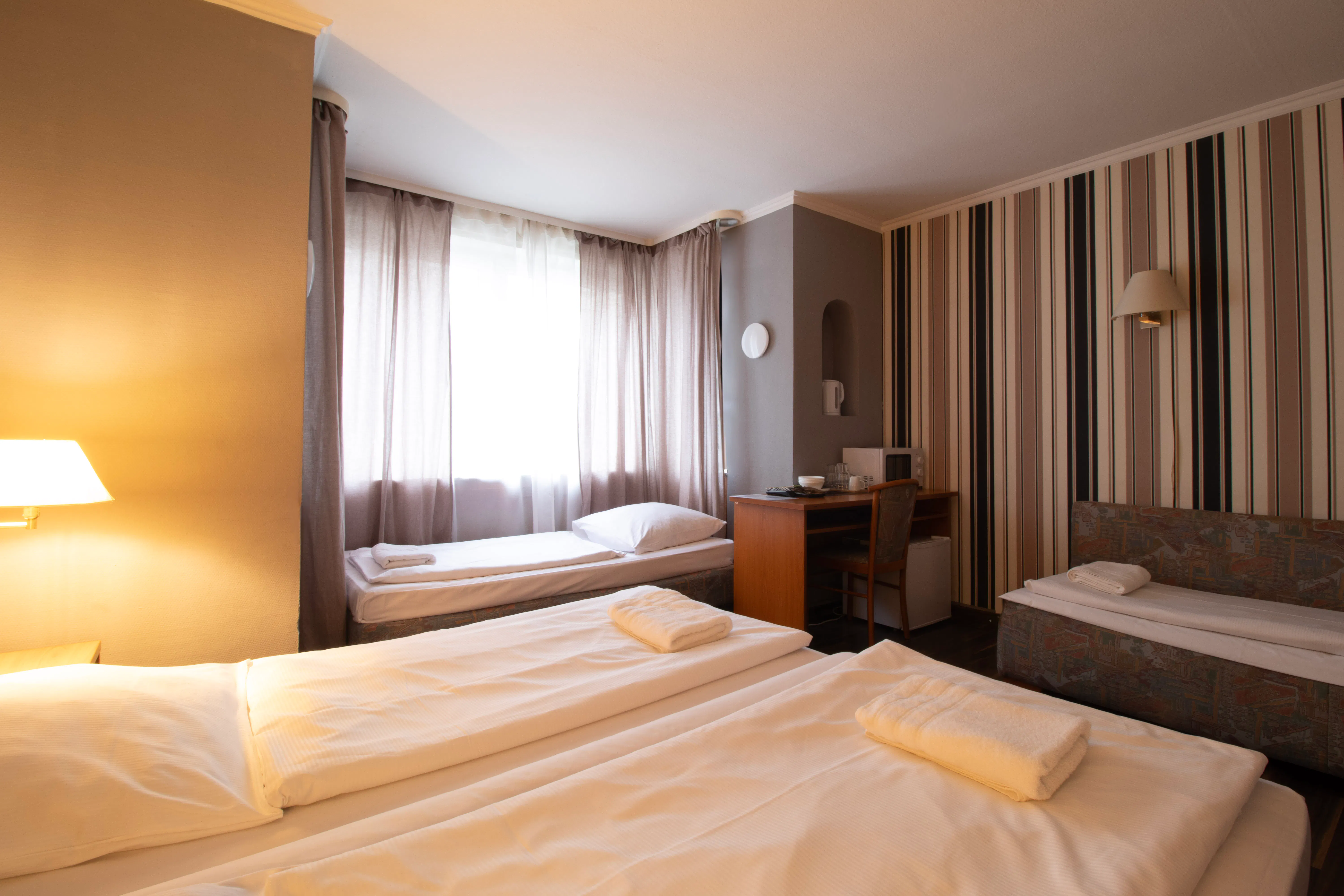 Cozy triple room with one double bed (180×200 cm) and one single bed (90×200 cm).